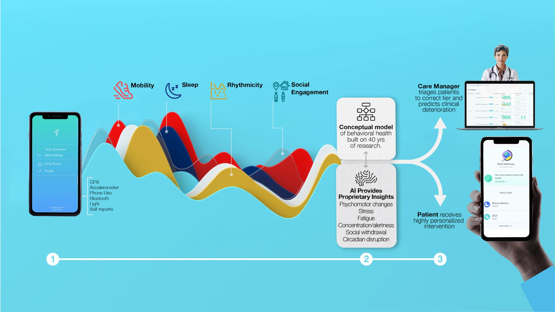 Cue was grounded in Ellen Frank’s Interpersonal and Social Rhythm Therapy and focused on identifying a person’s routine, sleep, social activity, physical activity and smartphone use, using Health Rhythms sensing library and then used this information to drive personalized recommendations. The elegance of this closed-loop approach, is that the engine can then see whether the recommendations had the desired effect: if Cue recommends that you try to get up consistently at 715am each day, it can also see if you were able to do that and then factor this information into the next recommendations.